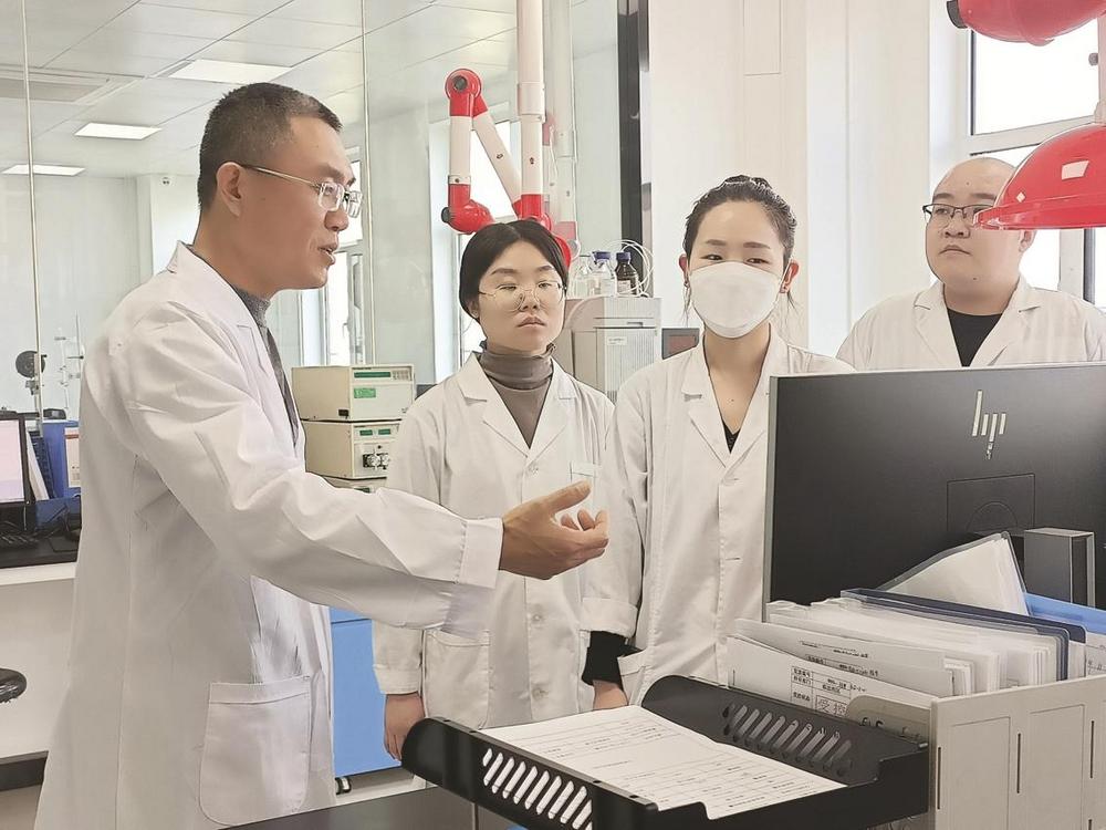 ④连运河,晨光生物科技集团股份有限公司副总经理。图为连运河(左)与晨光生物技术研发团队交流。