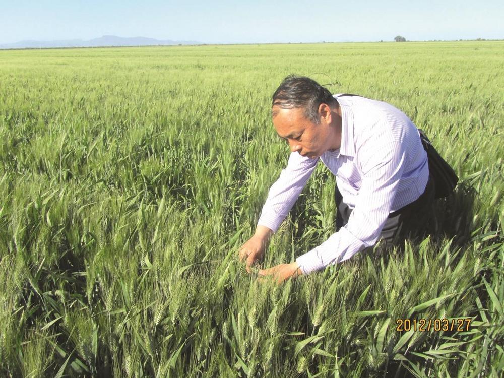 ①马永安,邯郸市农业科学院研究员、小麦育种专家。图为马永安在试验田察看小麦分蘖情况。