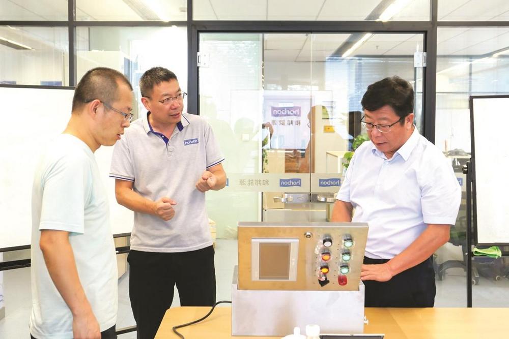 ③何立新,河北工程大学党委常委、副校长。图为何立新(右)在绿色能源设备研发企业考察。