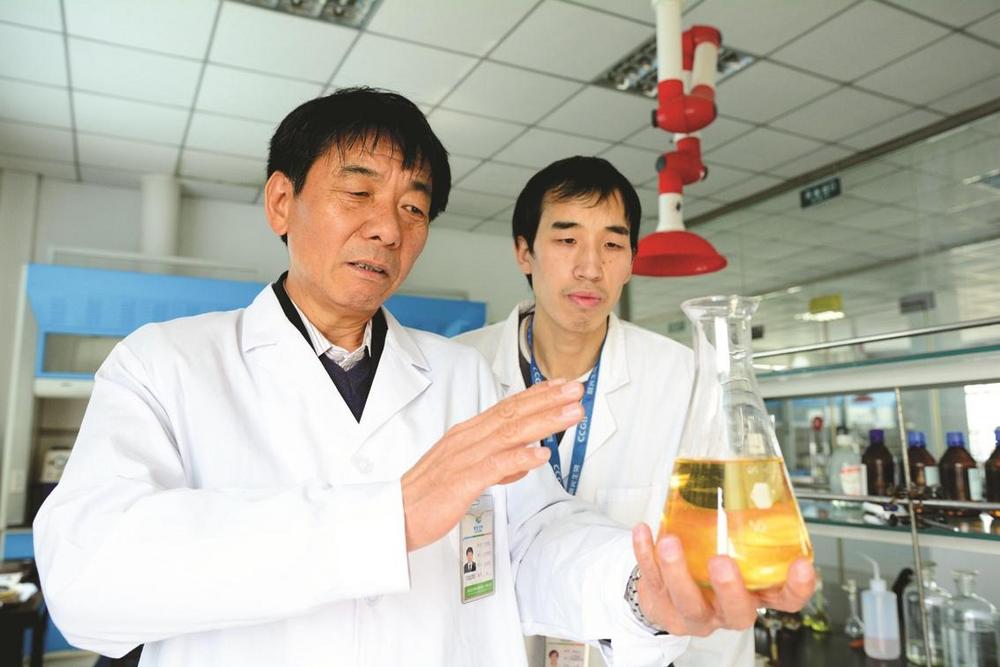 ②卢庆国,晨光生物科技集团股份有限公司董事长兼总经理。图为卢庆国(左)了解新产品研发情况。
